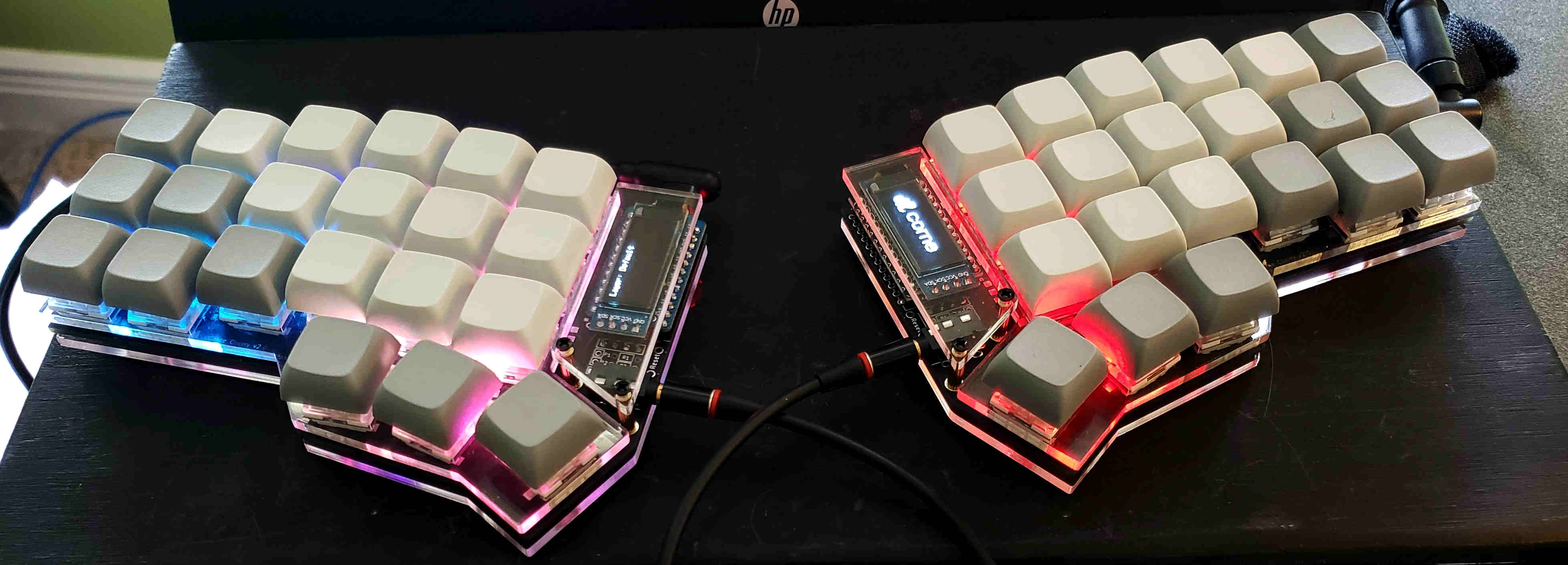 my thoughts: I don’t know why this thing has so many different names. I do know, however, that it is definitely my current favorite board. Same layout as the Iris but without the top number row. The OLED screens on the side are gimmicky but moving the TRRS jacks & controllers away from the keys allows this to stay much thinner, even without low profile switches.